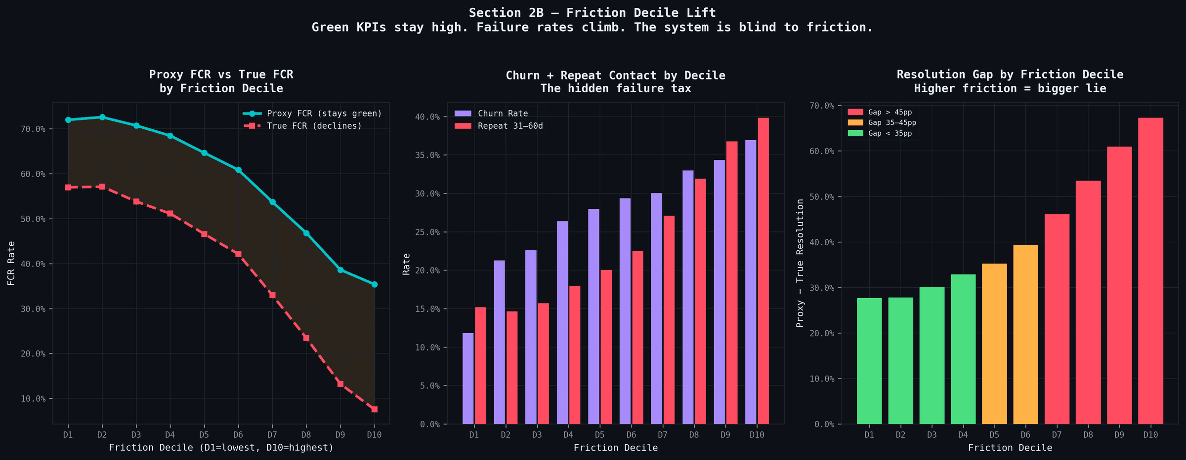 At higher customer friction levels, proxy resolution remains high while true resolution drops sharply, exposing KPI blindness to complexity.